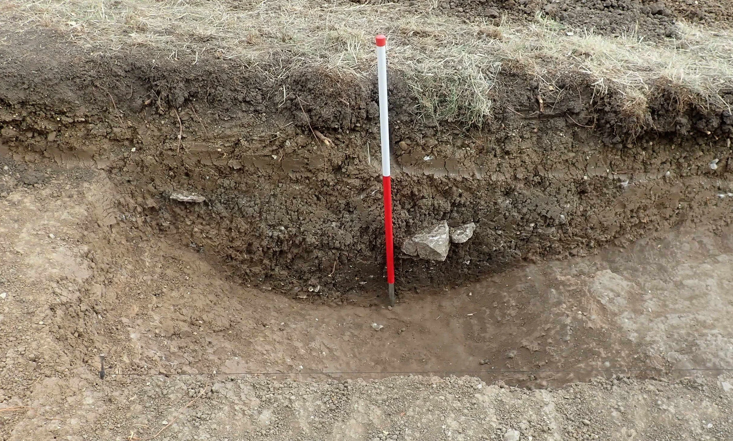 The 2025 trenches were opened by machine, operated by an experienced driver working under the direction of a professional archaeologist. The topsoil and subsoil were removed and machining ceased when the upper-most surviving archaeological level was exposed. Over the majority of Trenches 1 and 2, this top layer comprised a layer of Roman building debris although this was absent at the north ends of both trenches where the natural clay was present below the subsoil.