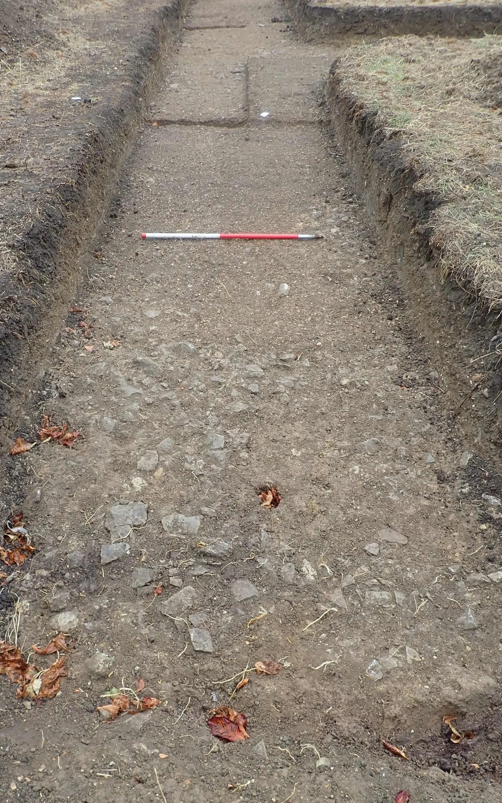 To the south of the hall-type building was an external surface comprised of small stones and in places gravel.