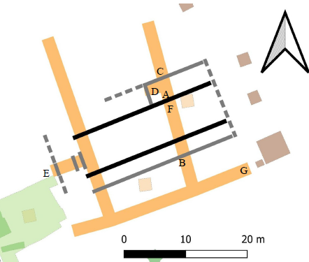 Plan of the hall-type building (main walls in black) and trenches (orange). Letters are the locations of the photographs below.